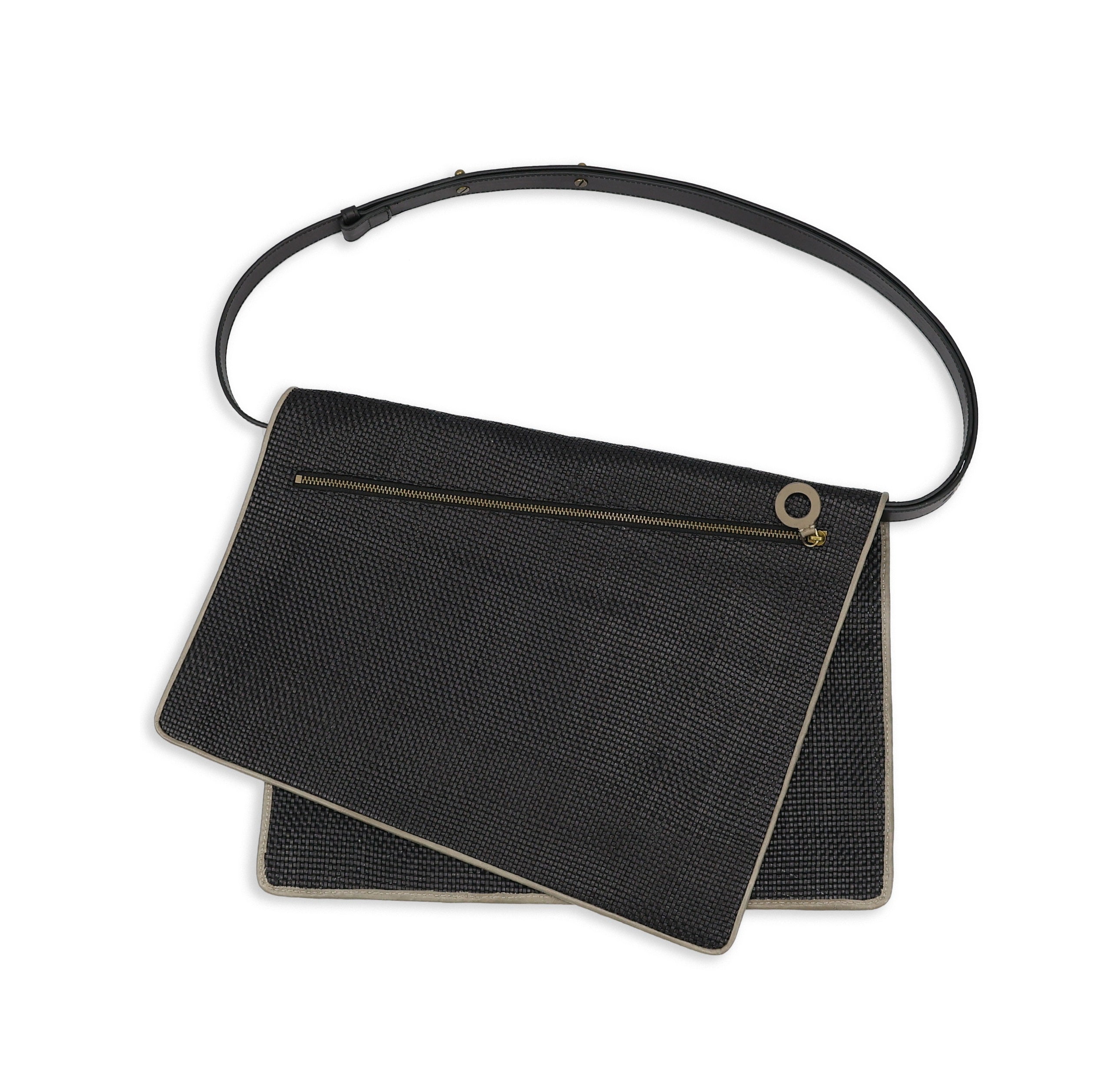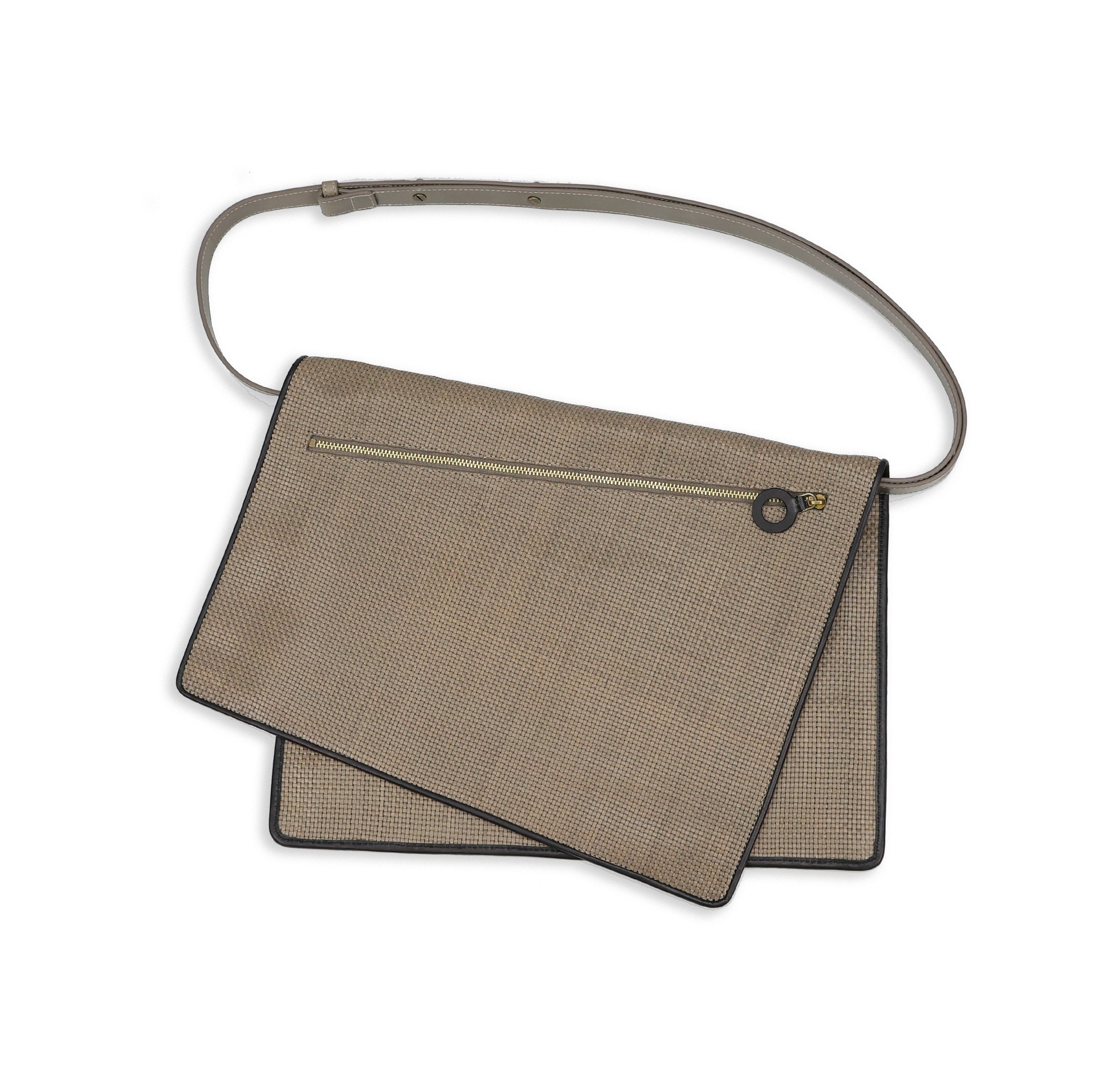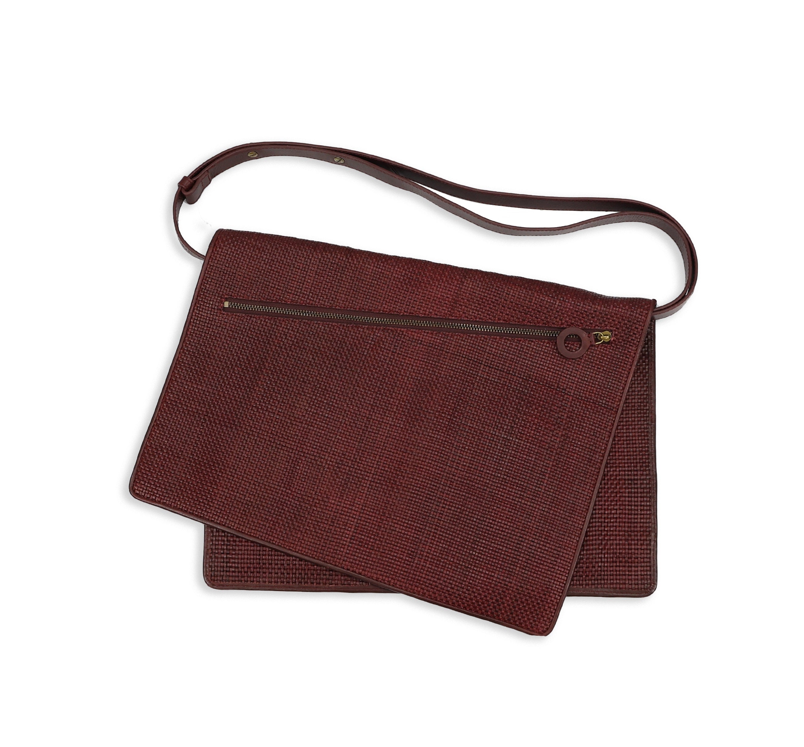 希少なバッファローカーフレザーを紐状に裁断して織り上げた素材を使用している為、軽くて、しなやかな素材です。平面的にも立体的にもなるデザインです。